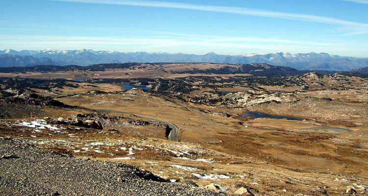 and brilliant blue alpine lakes. Can you see the road snaking below?