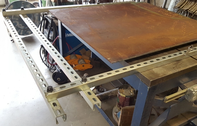 I have a heavily built welding table. I figure it weighs about a ton. The top has one tee slot in each direction. In the picture above I used the tee nuts to fasten the table to the bottom of a pair of outriggers. Outboard of the table are the other two pieces of strut which form a frame which holds up the piece being cut off the plate. The plate itself just sits on the table. In the next picture you can see everything in place for the cutting job.