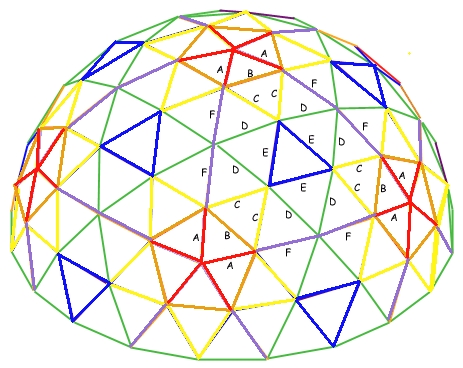 One of our kids is into music festivals and crazy costumes and started going to Burning Man. He joined a camp and after the first year he went he told me he wanted to make a geodesic desert dome to set up at Burning Man. He had done his homework and knew that he wanted to build it from 1" EMT, that is, steel conduit. Now, the cool thing about the Internet is that people publish smart things all the time. One thing that is very well understood is the design of geodesic domes. His camp had decided they wanted to make a 4V type dome and they wanted it to have a 13 foot base radius. The online calculator took those as inputs and gave back the lengths for each of six groups of parts. Apparently everyone uses the same nomenclature and names the six groups A, B, C, D, E and F. All parts in any group are identical but two parts from different groups will always be the same length. Here is an actual graphic downloaded from the dome calculator.