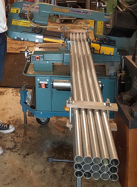We were faced with the problem of going from ideal lengths to the thousandth of an inch to something we could saw up on my horizontal band saw. Anyway, we added 1-1/2" to the ideal lengths to allow 3/4" to extend beyond each hole. We also rounded the ideal lengths to the nearest sixteenth of an inch. To facilitate cutting multiple parts all the same length I made up some simple clamps so that we could saw more than one part at a time.