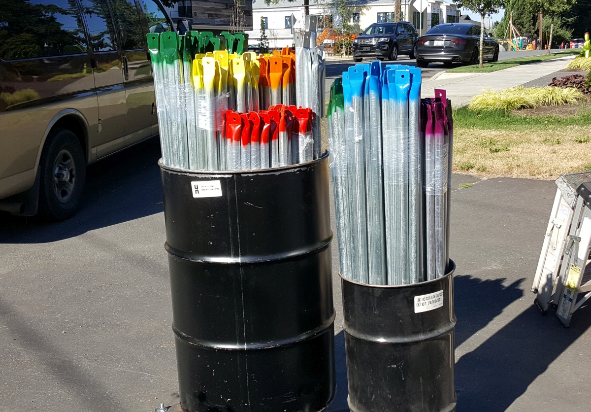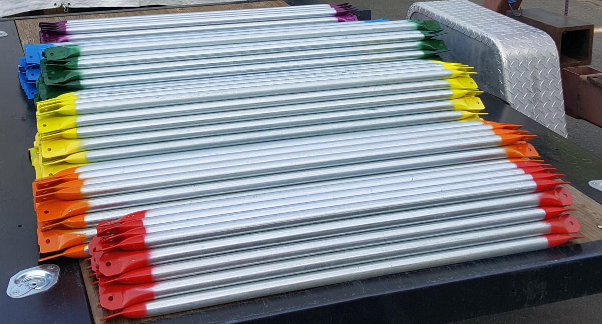 I chose the first six colors of the rainbow for my color scheme. I'm sure you recall that the colors of the rainbow make the acronym ROYGBIV, short for red orange yellow green blue indigo violet. I had all of these colors (ignoring violet since I only needed six colors) except indigo. I bought a can of "aubergine" (eggplant) color figuring it's sort of purple and thus might look a bit like indigo. I didn't do a fussy masking job. I set up a pair of sawhorses and layed out 30 struts to have the ends painted. I keep old aluminum license plates to do quick and dirty paint masking and this job being quick and dirty, I just taped them together. I left 3 or 4" uncovered at an end and just sprayed color on the end, approximately masked by the license plates. Then I moved my "mask" to the other end and painted that end. After 15 minutes or so, I'd carefully turn each part over, then repeat the process to get the other side of the ends. Then I let the parts sit in full sun for an hour or two. After that, they were plenty dry enough to touch, so I removed the parts from the sawhorses and left them in a pile on a tarp to fully cure for a day or two.