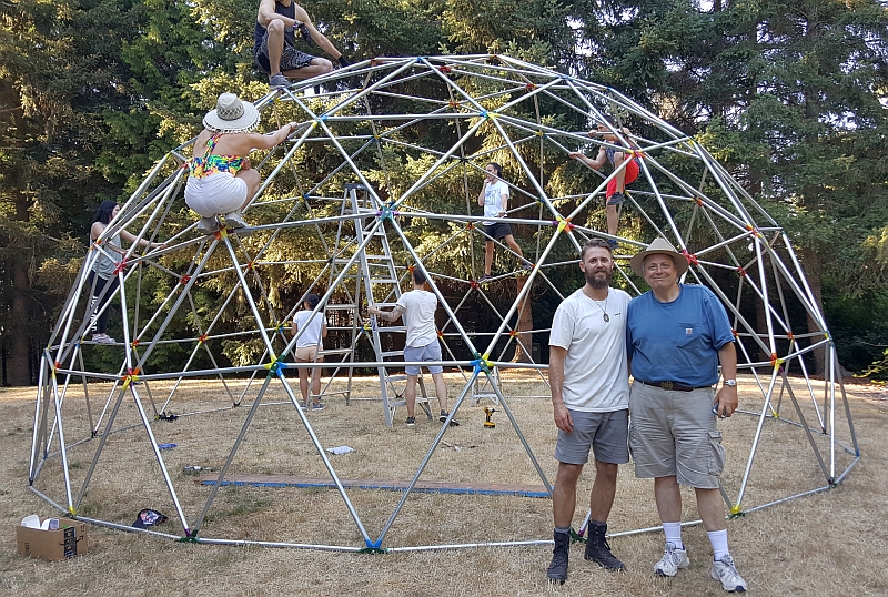 Putting up the dome in the park was loads of fun. Here is a shot of the erected geodesic dome with me and my son Colin in the foreground.