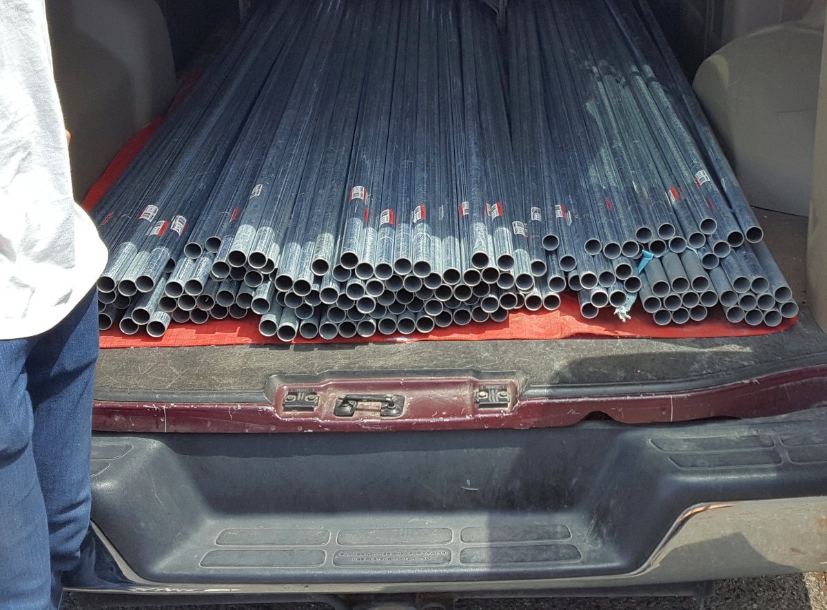 The online dome calculator calculates ideal lengths between intersection points. In the real world, the relevant length is the distance between two holes, one at each end. I did a little pencil work and figured we would need 120 ten foot lengths of 1" EMT. Here is a shot of the EMT tubes still in the van the day we bought them.