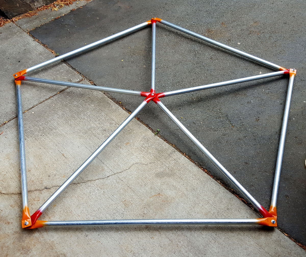 By this time we'd put in a considerable amount of work without knowing if we'd gotten the hole pitches right. I decided to connect just the very top bit of the dome as a sanity check to make sure things were OK. (They were!) You can compare the parts assembled in the photo to the diagram at the top of this page.