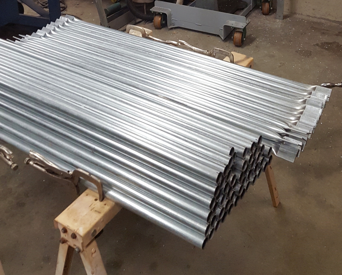 I had previously installed a 3/8" punch in my little ironworker. Because of the topology of the flattened ends, some distortion of the flat ends was introduced by punching. But the punching itself was easy and went fast. You feel with a part end until you could feel the punch mark slip over the tit on the punch. Holding it there, we'd step on the pedal and a second or so later, we had a nice 3/8" hole. As I mentioned earlier, punching the holes bent the ends a bit, so the next step was to the anvil where a few taps with a hammer re-flattened the ends easily. Next, it went to the belt sander where we'd sand both ends of each part. We added a radius to each corner, and made the ends smooth so nobody would get cut by catching their skin on some ragged corner. Once the sanding was finished, we used a sharpie to label the part with its batch letter (one of A, B, C, D, E or F) and set it aside for later processing. These steps were repeated for each part in the group.